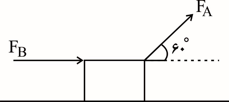در شخص A و B برای جابجا کردن یک جعبه سنگین روی سطحی هموار به ترتیب نیروهای $F_B=۳۰۰N,F_A=۶۰۰N$ را مطابق شکل زیر به جعبه وارد میکنند. اگر کار کل انجام شده بر روی جعبه در ۱۵m اول برابر ۶kJ باشد ، انگاه اندازه نیروی اصطکاک جنبشی در این جایجایی در SI کدام است؟