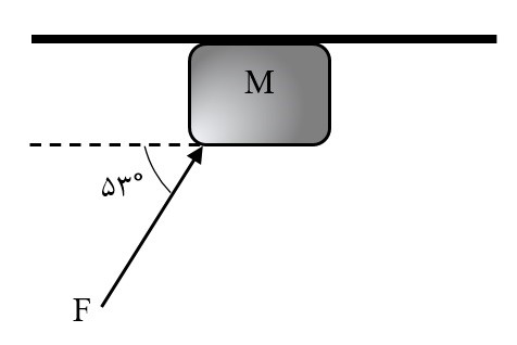 مطابق شکل زیر، جسمی به جرم $m=۰/۵~Kg$ تحت تأثیر نیروی $F=۱۰~N$ ، زیر سقف افقی اتاق به حرکت در میآید. اگر ضریب اصطکاک بین جسم و سقف یک باشد، جسم در دو ثانیه اول حرکت چند متر جابجا میشود؟ ($g=۱۰\frac{m}{{{s}^{۲}}}$ و $\sin ۵۳{}^\circ =۰/۸$)