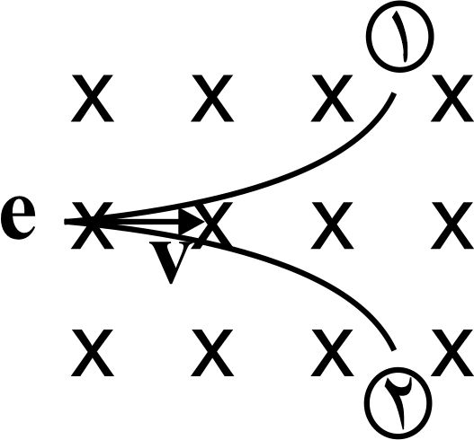 الکترونی مطابق شکل وارد میدان مغناطیسی یکنواخت و درونسویی شده است. مسیر حرکت الکترون کدام است و انرژی جنبشی الکترون حین عبور از میدان چگونه تغییر می کند؟