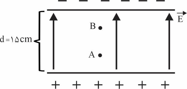 یک ذره با بار الکتریکی $+۰/۲\text{ }\!\!\mu\!\!\text{ }c$ و جرم $۲g$ مطابق شکل در یک میدان الکتریکی یکنواخت به اندازه $۵\times {{۱۰}^{۴}}\frac{N}{C}$ قرار دارد. در نقطه $A$ انرژی پتانسیل الکتریکی ذره دو برابر انرژی پتانسیل گرانشی ذره است و در نقطه $B$ انرژی پتانسیل الکتریکی و انرژی پتانسیل گرانشی ذره باهم برابر است. فاصله $A$ و $B$ چند سانتی متر است؟ (مبنای انرژی پتانسیل الکتریکی را صفحه منفی و مبنای انرژی پتانسیل گرانشی را صفحه مثبت در نظر بگیرید و $g=۱۰\frac{m}{{{s}^{۲}}}$)