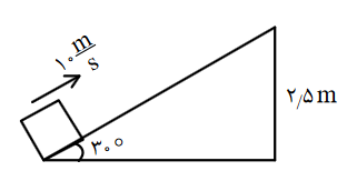 مطابق شکل جعبهای به جرم \[2kg\] را با تندی \[10\,\frac{m}{s}\] روی سطح شیبدار رو به بالا پرتاب میکنیم. اگر اندازة نیروی اصطکاک روی سطح شیبدار ثابت و برابر N5 باشد، سرعت جعبه هنگام ترک سطح شیبدار برابر چند متر بر ثانیه میباشد؟
