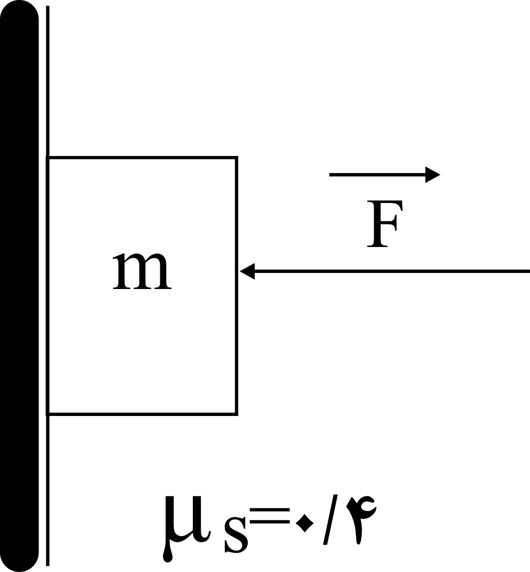 مطابق شکل جسمی توسط نیروی افقی$F=۸۰N$ به دیوار فشرده شدهاست و جسم درآستانۀ حرکت قرار دارد. اگر بزرگی نیروی$F$ را $۳۰N$ کاهش دهیم، جسم با شتابی به بزرگی $۵m/s^{۲}$ حرکت می کند. ضریب اصطکاک جنبشی جسم با دیوار کدام است؟$\left ( g=۱۰m/s^{۲} \right ) $
