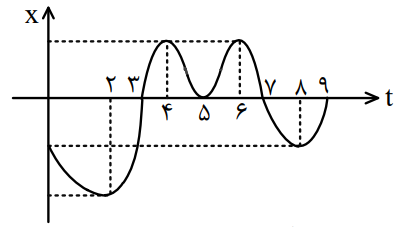 شکل مقابل نمودار مکان ـ زمان متحرکی را در حرکت روی خط راست نشان میدهد. این متحرک ......... بار از مبدأ مکان عبور کرده و ......... بار از نقطۀ شروع حرکت عبور کرده و در ثانیۀ ......... در حال نزدیک شدن به مبدأ است.
