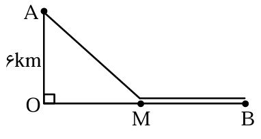 قرار است از شهر \[A\] مطابق نقشۀ مقابل راهی از طریق شهر \[M\] به شهر \[B\] برسانیم. اگر $OB = 17$ بهطوری که هزینۀ هر کیلومتر جادهسازی از \[A\] به \[M\]، \[10000\] تومان و هر کیلومتر جادهسازی از \[M\] به \[B\]، \[8000\] تومان هزینه داشته باشد، با \[172000\] تومان جادۀ \[A\] به \[B\] را ساختهایم، فاصلۀ \[M\] تا نقطۀ \[B\] کدام است؟