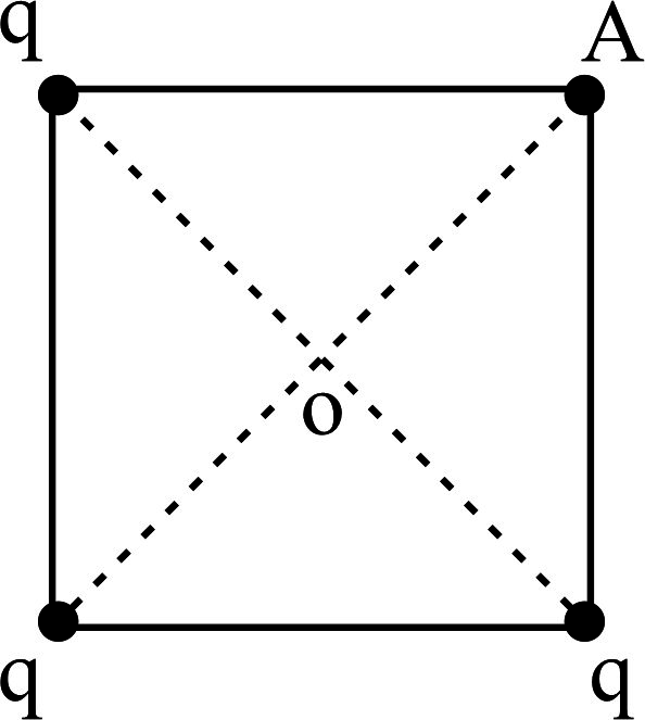 مطابق شکل بارهای هم اندازه q در سه راس مربعی قرار گرفته اند. اندازه میدان برآیند ناشی از بارها در مرکز مربع (نقطه O ) چند برابر میدان برآیند بارها در نقطه A است ؟