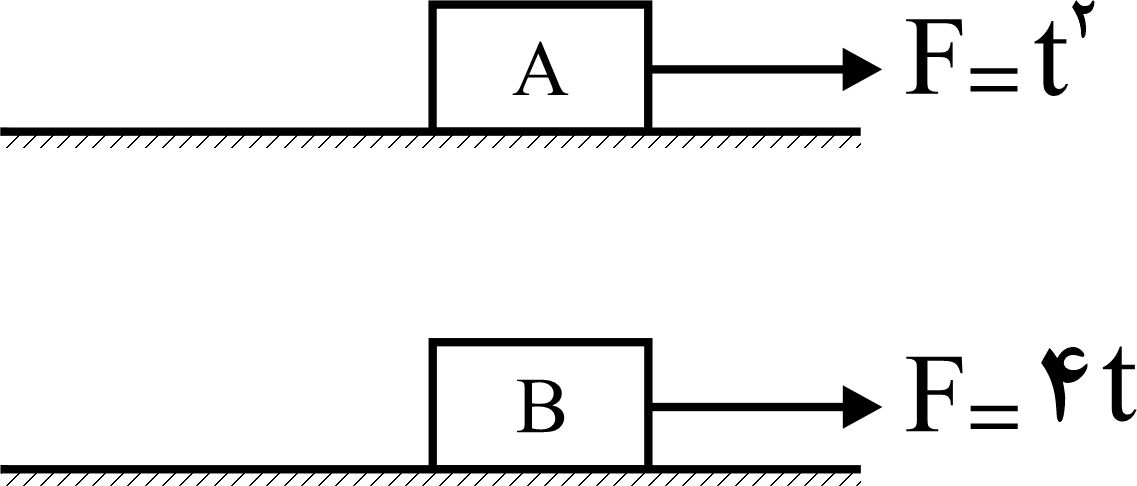 مطابق شکل دو جسم A وB روی یک سطح افقی بدون اصطکاک قرار گرفته اند و به آنها نیروی متغیر با زمان وارد می شوند . در بازه زمانی صفر تا ۴Se متوسط نیروی خالص وارد بر دو جسم $\vec{F_{A}}$و $\vec{F_{B}}$ می باشد . کدام گزینه زیر درباره این نیرو ها درست است ؟