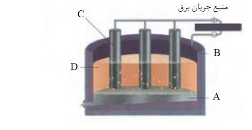 شکل زیر فرایند هال برای تولید آلومینیوم از $A{{l}_{۲}}{{O}_{۳}}$ را نشان میدهد. با توجه به شکل، $D,C.B.A$ به ترتیب از راست به چپ کدام هستند؟