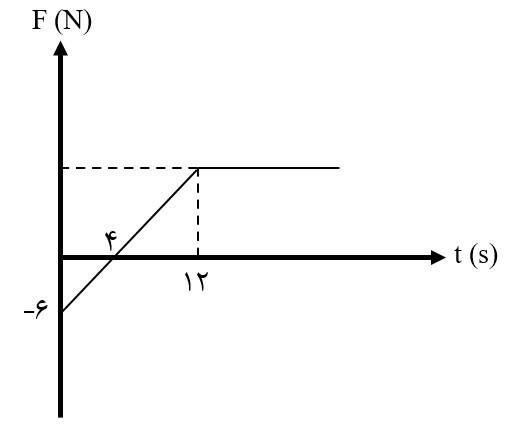 جسمی به جرم $۴kg$ تحت تأثیر نیروی متغیری مطابق شکل زیر از حال سکون به حرکت در میآید. بزرگی نیروی متوسط وارد بر جسم از ${{t}_{۱}}=۱۰~s$ تا ${{t}_{۲}}=۱۵~s$ چند نیوتن است؟