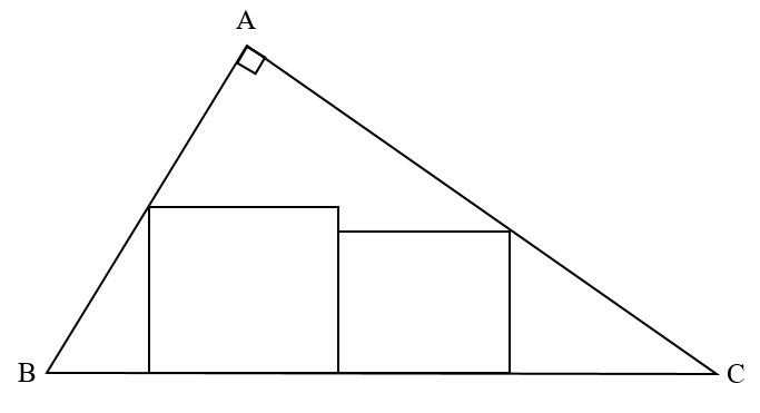 دو مربع داخل مثلث قائم الزاویه ABC به اضلاع $AB=۶$ و $AC=۸$ و $BC=۱۰$ قرار گرفتهاند. اگر طول ضلع مربع کوچک ۲ واحد باشد، طول ضلع مربع بزرگ چقدر است؟