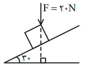 طبق شکل روبهرو جسم تحت تأثیر نیروی F، \[10{\kern 1pt} cm\] روی سطح شیبدار پایین میآید. در این جابهجایی کار انجام شده توسط نیروی F چند ژول است؟