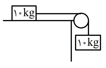 در شکل مقابل دستگاه از حال سکون به حرکت درمیآید و پس از 2 متر جابجایی تندی وزنهها به \[3\frac{m}{s}\] میرسد. در این مدت چند ژول انرژی مکانیکی تلف میشود؟
