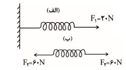 از یک فنر با جرم ناچیز که طول عادی آن $۶۰cm$است مطابق شکل در دو حالت (الف) و (ب) استفاده کردهایم. اگر طول فنر در آزمایش (الف) برابر $۶۴cm$ باشد طول فنر در آزمایش (ب) چند سانتی متر میشود؟