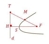 در شکل زیر یک سهمی به کانون $F$، رأس $S$ و خط هادی $d$ رسم شده است. اگر فاصلۀ کانونی سهمی برابر $a$ و فاصله $M$ تا $F$ برابر $b$برابر باشد، طول $MT$ با کدام گزینه برابر است؟