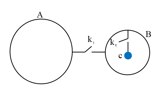 شکل روبهرو پوستههای رسانای $A$ و $B$ با شعاع ${{r}_{A}}=۴cm$ و ${{r}_{B}}=۲cm$ دارای بار الکتریکی ${{q}_{A}}=۱۶\mu c$ و ${{q}_{B}}=۸\text{ }\!\!\mu\!\!\text{ c}~$ هستند. گوی رسانای $C$ با بار ${{q}_{c}}=-۶\mu c$ منزوی و درون پوستۀ $B$ قرار دارد. با وصل کلیدهای ${{K}_{۱}}$ و ${{K}_{۲}}$، پس از به تعادل رسیدن مجموعه، بار پوستۀ $A$ برابر با $۱۲\mu c$ میشود. بار پوستۀ $B$ چند میکروکولن شده است؟