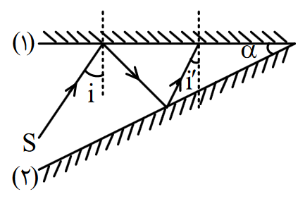 مطابق شکل، پرتوی نوری با زاویة \[\alpha \] به آینة (1) تابیده و پس از بازتاب به آینة (2) برخورد میکند. اگر زاویة بین پرتوی تابش به آینة (1) و بازتابش از آینة (2)، \[{140^ \circ }\] درجه باشد، \[\alpha \] چند درجه است؟ (زاویۀ بین دو آینه حاده است.)