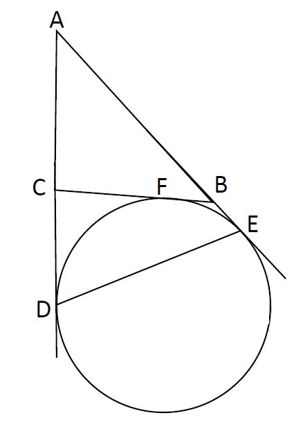 مطابق شکل، دایرۀ محاطی خارجی نظیر ضلع $BC$ از مثلث $ABC$ رسم شده است و در نقاط $E$، $F$ و $D$ بر اضلاع مثلث مماس است. اگر محیط مثلثهای $ABC$ و $AED$ به ترتیب $۲۶$ و $۳۶$ واحد باشد، اندازۀ $ED$ کدام است ؟