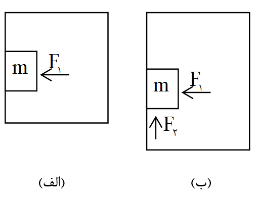 مطابق شکل (الف) جسمی به جرم $۴kg$ روی دیوارۀ آسانسوری که با شتاب $۳{}^{m}/{}_{{{s}^{۲}}}$ به صورت تند شونده در حال بالا رفتن است، در آستانه لغزش قرار دارد. در شکل (ب) آسانسور با همان شتاب $۳{}^{m}/{}_{{{s}^{۲}}}$ به صورت تند شونده به سمت پایین در حال حرکت است. بیشینه اندازه نیروی ${{F}_{۲}}$ چند نیوتون باشد تا جسم روی دیوارۀ آسانسور نلغزد؟ $\left( g\simeq ۱۰\frac{m}{{{s}^{۲}}} \right)$