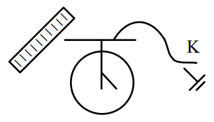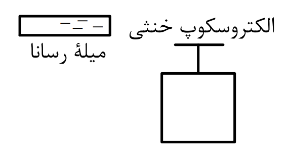در شکل مقابل اگر در حضور میله کلید را وصل و سپس قطع کنیم، ورقههای الکتروسکوپ ......... و اگر میله را دور کنیم ورقهها ......... و اگر در این وضعیت یک میلة خنثی به کلاهک الکتروسکوپ نزدیک کنیم ورقهها ......... .