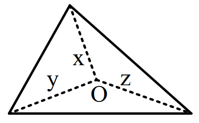 شکل روبهرو مثلث متساویالاضلاعی به ضلع a و O نقطهای دلخواه داخل مثلث میباشد. اگر \[x + y + z = t\] باشد، کدام گزینه صحیح است؟