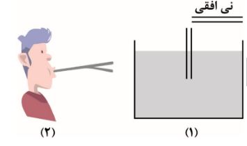 در شکل روبهرو با دمیدن در نی افقی وضعیت مایع در لوله قائم شکل (۱) و با دمیدن بین ورقهها درشکل (۲) وضعیت ورقهها به ترتیب از راست به چپ چگونه تغییر میکند؟