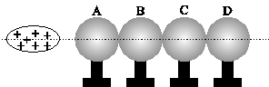 در شکل مقابل چهار کره رسانای مشابه در نزدیکی میله با بار مثبت قرار دارند. اگر ابتدا کرة A را دور و سپس میله با بار مثبت را از کرهها دور کنیم بار کرة D برابر $ + 4\mu C$ میشود بار ایجاد شده در کرة B و A به ترتیب از راست به چپ چند $\mu C$ است؟ (بار میلۀ نزدیک شده متقارن و محور اجسام یکی است.)