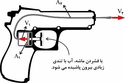شکل روبهرو یک تفنگ آب پاش را نشان میدهد که با فشردن ماشه آن، آب با تندی زیادی بیرون میآید. اگر $A_۲=۰/۵cm^۲,A_۱=۳cm^۲ $ باشند و تندی خروجی آب برابر $\ ۶\frac{cm}{S}$ باشد، آن گاه $V_۱$ بر حسب $\frac{m}{S}$ کدام است؟
