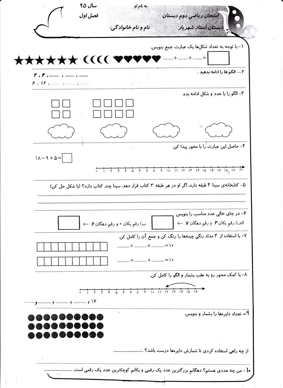 آزمون فصل اول ریاضی پایهی دوم دبستان