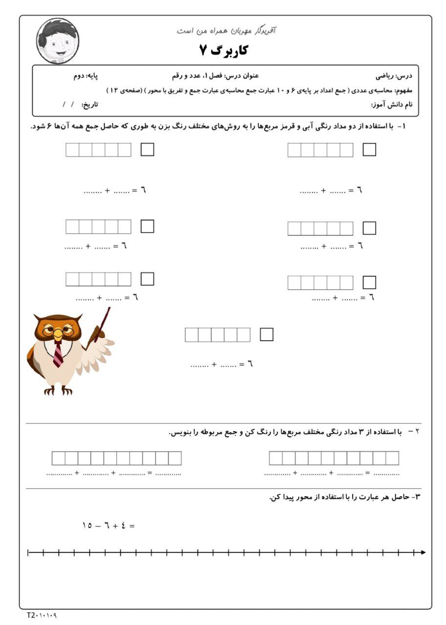 کاربرگ فصل 1 ریاضی دوم ابتدایی مباحث جمع اعداد بر پایهی 6 و 10 و محاسبهی عبارت جمع و تفریق با محور