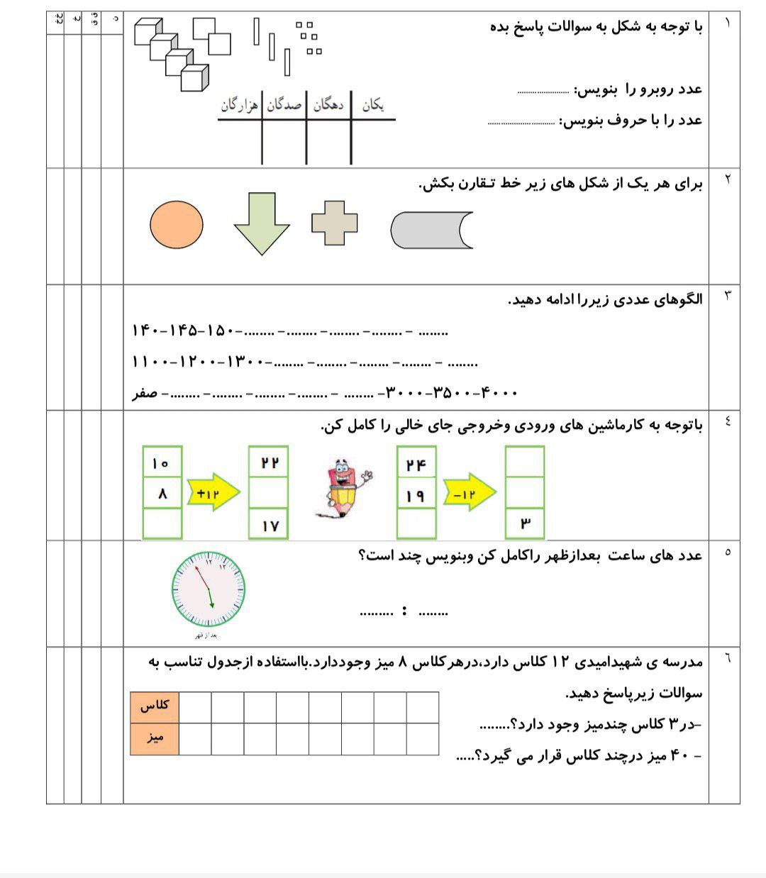 کاربرگ مبحث ماشین ورودی و خروجی از فصل اول ریاضی سوم ابتدایی