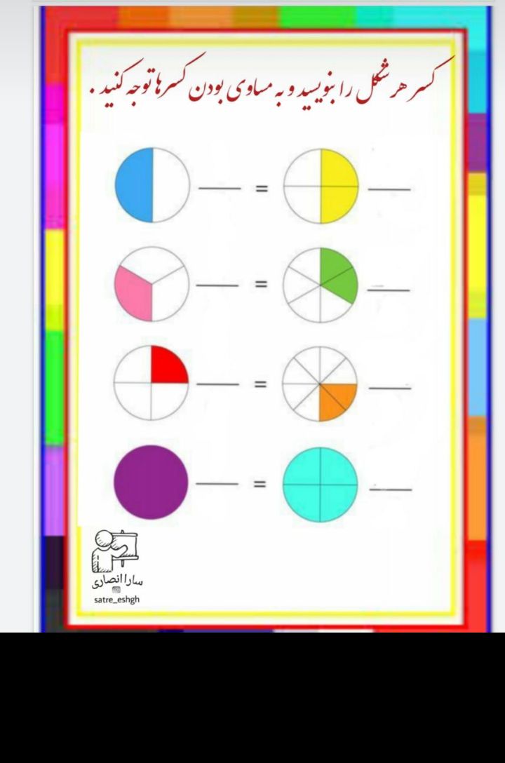 کاربرگ تمرینی مبحث تساوی کسرها با کمک شکل - فصل سوم ریاضی سوم ابتدایی