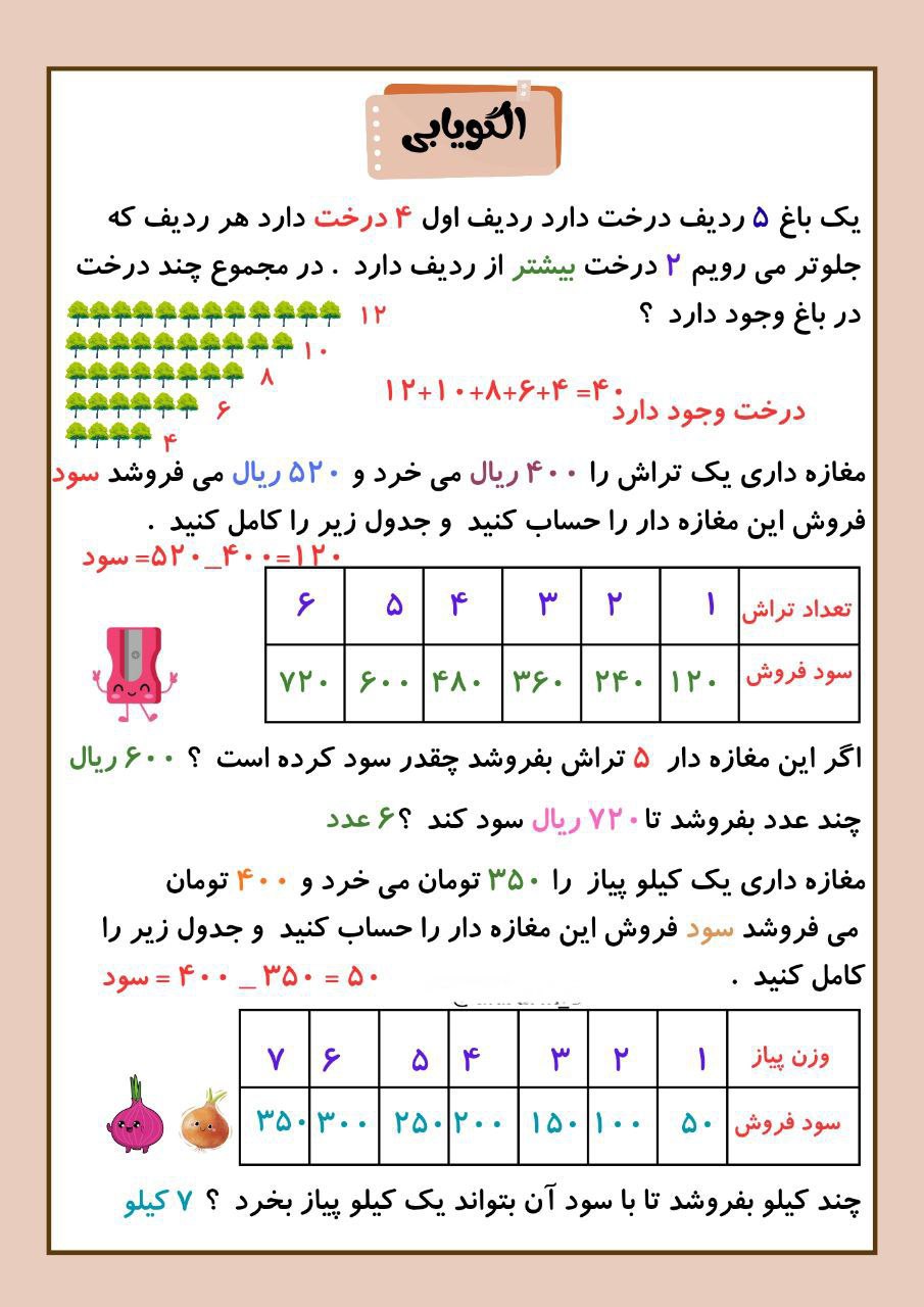 کاربرگ مبحث الگویابی از فصل اول ریاضی سوم ابتدایی همراه با پاسخ