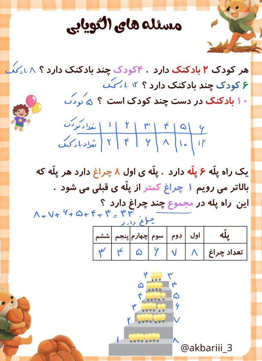 کاربرگ مبحث مسئلههای الگویابی از فصل اول ریاضی سوم ابتدایی + پاسخ