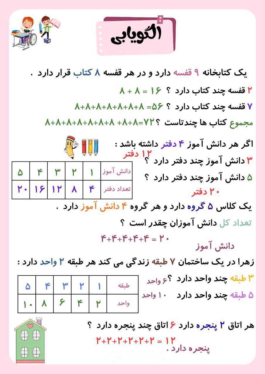 کاربرگ‌ مبحث الگویابی از فصل اول ریاضی سوم ابتدایی همراه با پاسخ