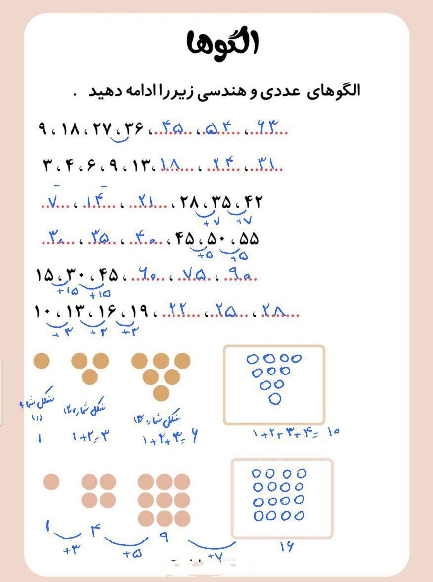 کاربرگ مبحث الگویابی از فصل اول ریاضی سوم ابتدایی همراه با پاسخ