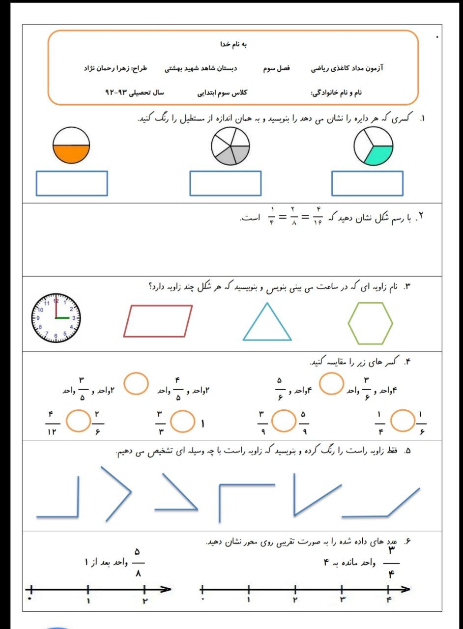 دیگر نمونه سوالهای فصل 3: عددهای کسری ریاضی (سوم)